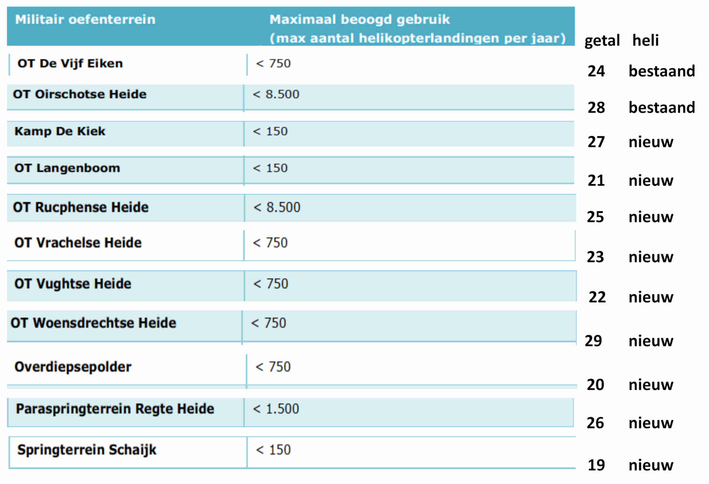 Landende helikopters in NBrabant Defensie wil ook het aan de grond zetten van helikopters, en de daarbij horende, militaire operaties oefenen. Op dit moment landen er helikopters op twee bestaande Brabantse oefenterreinen (De Vijf Eiken en de Oirschotse Heide). Impliciet lijkt het erop dat het aantal landingen op de twee bestaande terreinen gelijk blijft, maar dat staat niet met zoveel woorden op papier. Defensie wil op negen bestaande oefenterreinen, waar dat nu niet gebeurt, het landen met helikopters mogelijk maken. Bovenstaande kaart en legenda geven aan wat de bedoeling is. Het is de bedoeling dat, over heel Nederland, het aantal landingen stijgt van 5320 naar 24000.
