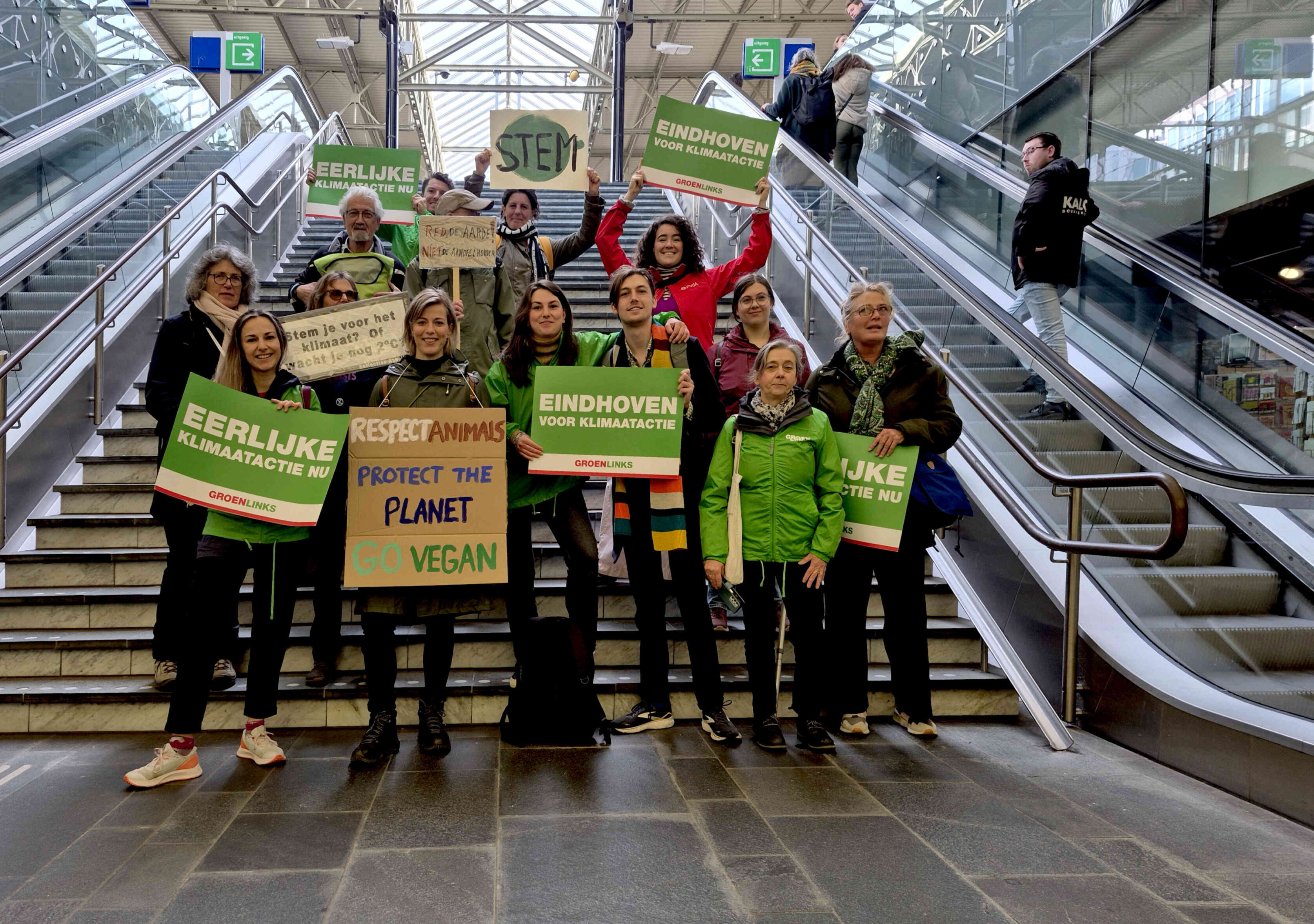 Aan mij de taak om iets collectiefs te verzinnen voor de heenreis. Er waren duidelijk te weinig mensen voor een bus, en de groepsticket van de NS werkt onhandig. Vandaar het idee om een groepsfoto van de gezamenlijke afreizers te maken op de trap naar perron 5.