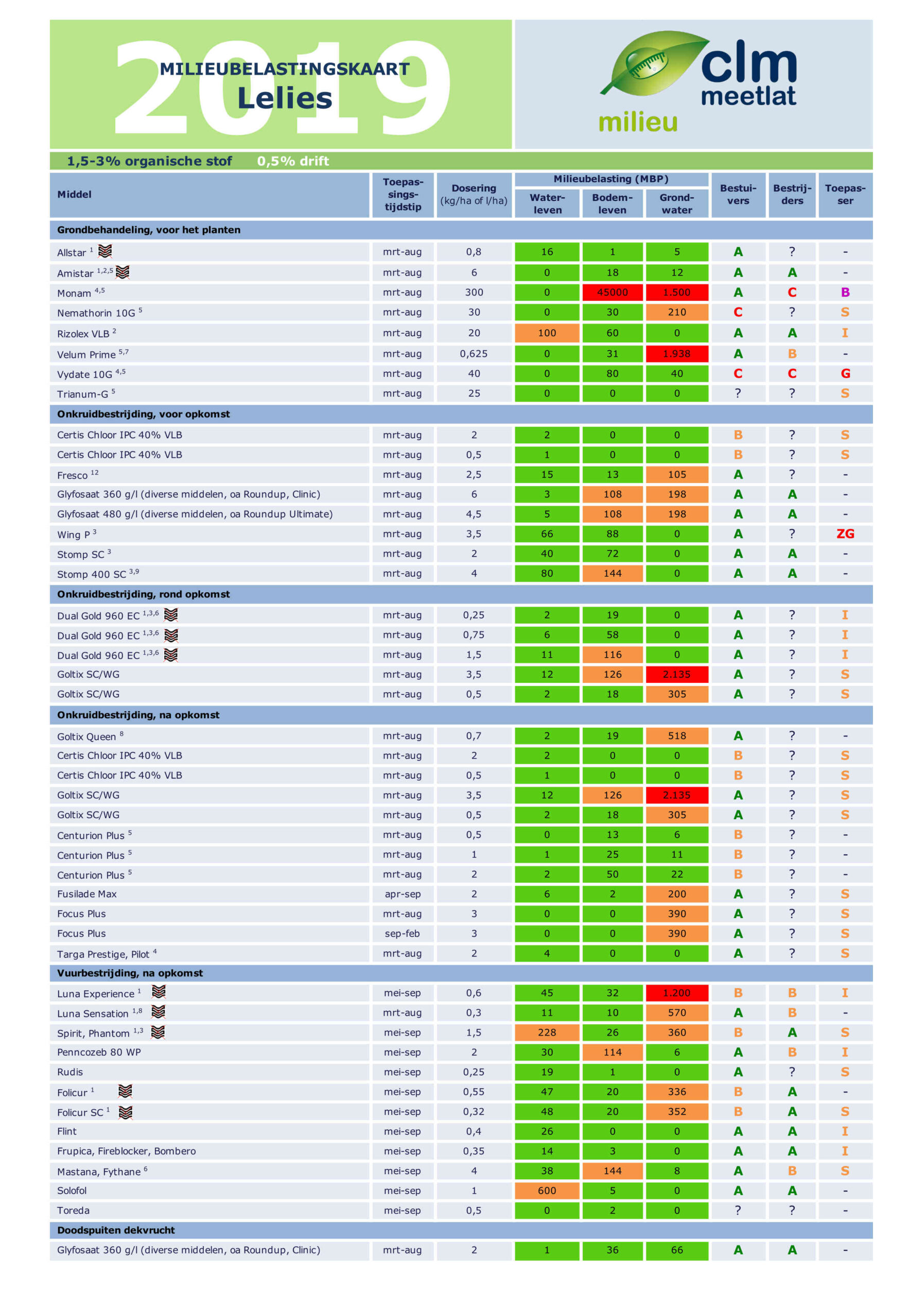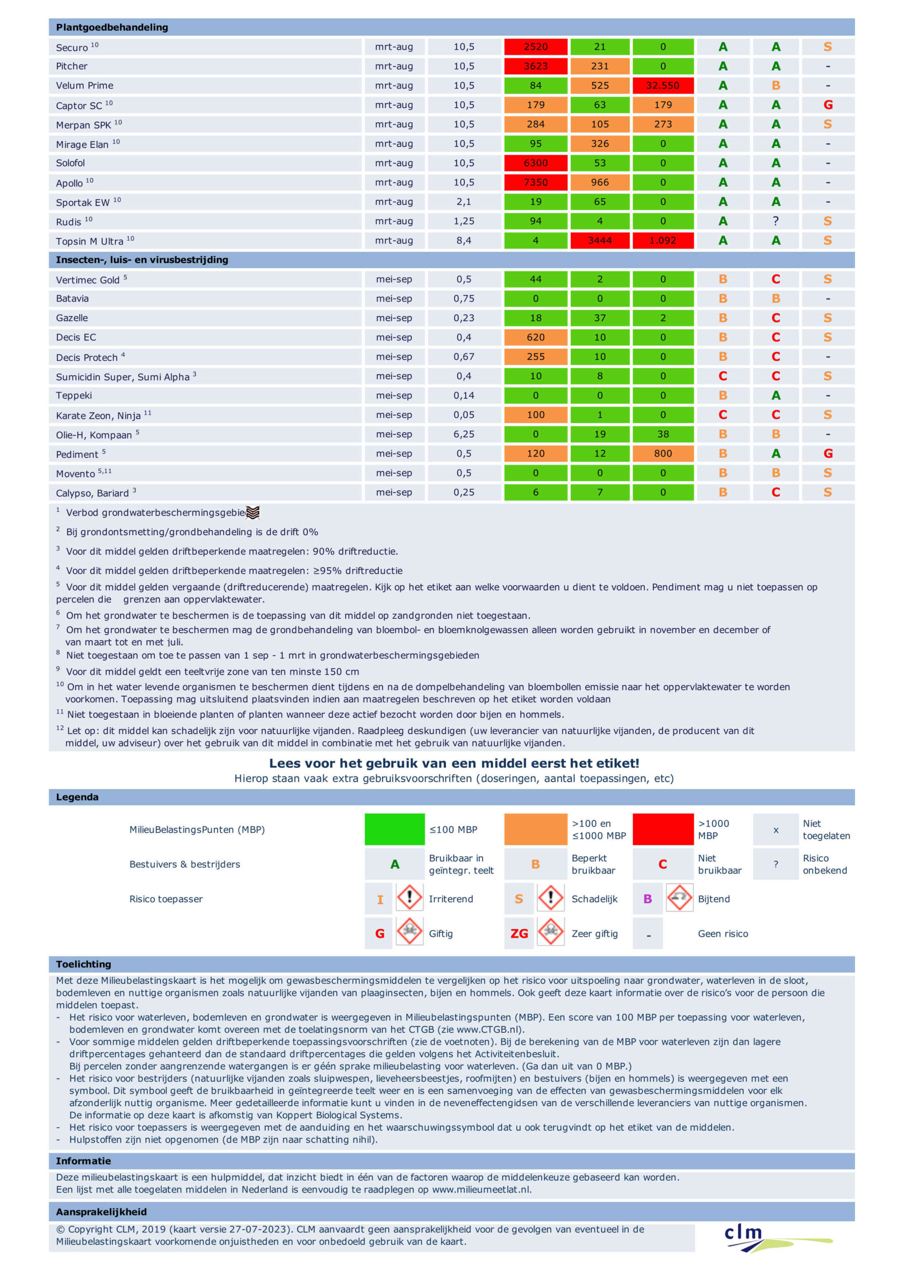 Onderstaand overzicht is voor heel veel gewassen te vinden op https://www.milieumeetlat.nl/nl/milieubelastingkaarten/language/nl.html .