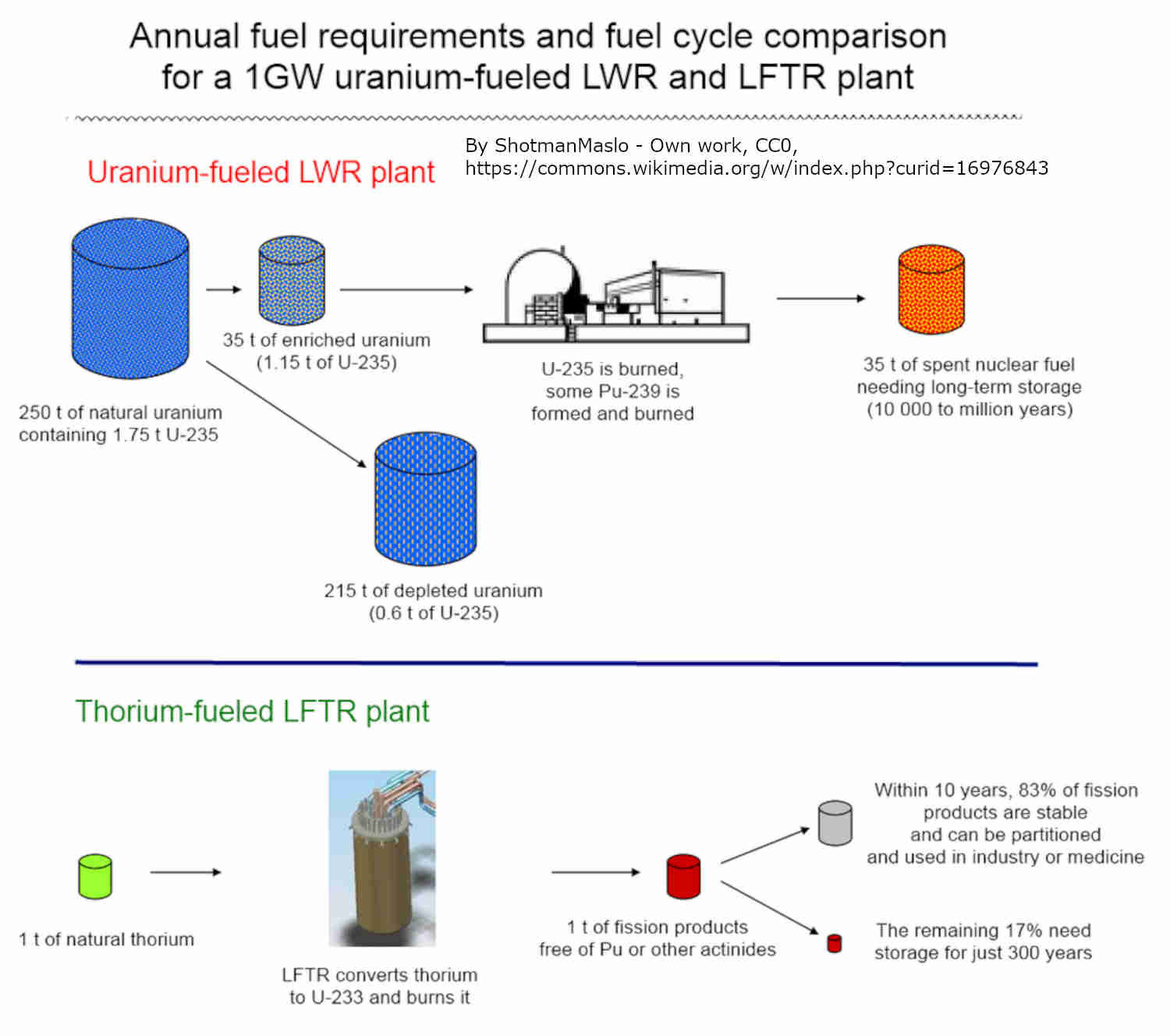 Een LFTR produceert zelf nauwelijks of geen langlevend afval omdat het proces niet of nauwelijks boven de U-233 uitkomt (dat splijt bijna volledig). 83% van het radioactieve afval moet dan 10 jaar opgeslagen worden, en de rest 300 jaar. Dan is alles terug, of onder, het oorspronkelijke radioactieve niveau. Het is een politiek standpunt wat men van die resterende opslagtermijn vindt. Ik vind het persoonlijk te overzien.