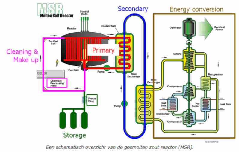 - Een Molten Salt Reactor (MSR) zegt ook niet meer dan de term aanduidt: het koelmiddel is gesmolten zout. Ook een MSR kan op allerlei ‘brandstoffen’ en technieken gebaseerd zijn.