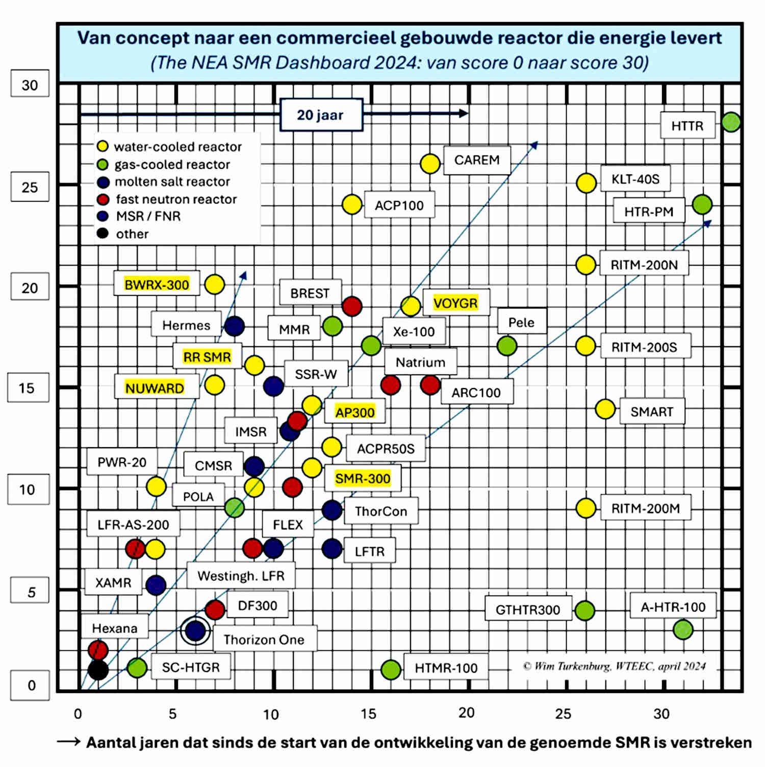 Turkenburg werkt met het puntensysteem van het NEA SMR Dashboard (NEA = Nuclear Energy Agency). Een ontwerp kan voor een aantal tussenstappen punten krijgen en bij 30 punten is er sprake van een opgeleverde, commercieel werkende centrale. Bij Turkenburg staat een groot aantal SMR-ontwerpen in een diagram (jaar sinds de start versus het aantal punten)