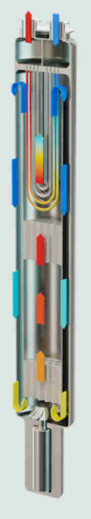 Hogere temperaturen echter bevorderen het rendement. Vandaar dat men er bij LFTR-en voor gekozen heeft voor een koelvloeistof die meestal bestaat uit een mengsel van gesmolten lithium- en berylliumfluoride (afgekort FLiBe, wikipedia.org/wiki/FLiBe ) dat, bij een druk die niet ver boven de atmosferische ligt en bij een optimale mengverhouding, een smeltpunt heeft van 459˚ C. Een reactor moet daar een eind boven zitten (bij Thorizon 550˚.C).